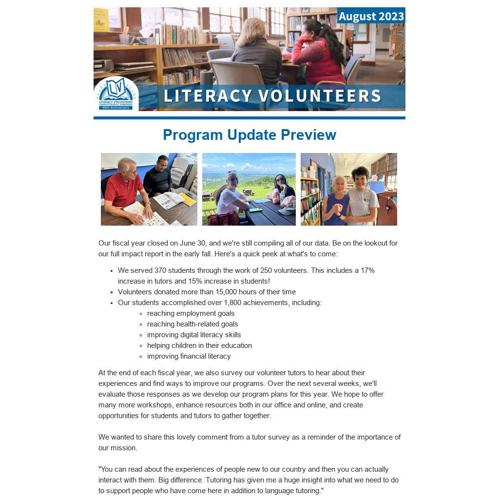 At the end of each fiscal year, we also survey our volunteer tutors to hear about their experiences and find ways to improve our programs. Over the next several weeks, we'll evaluate those responses as we develop our program plans for this year. We hope to offer many more workshops, enhance resources both in our office and online, and create opportunities for students and tutors to gather together.