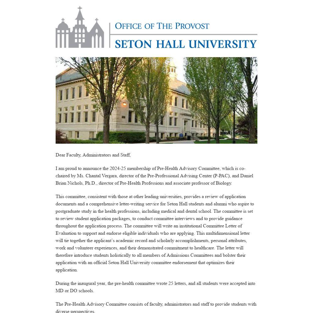 This committee, consistent with those at other leading universities, provides a review of application documents and a comprehensive letter-writing service for Seton Hall students and alumni who aspire to postgraduate study in the health professions, including medical and dental school. The committee is set to review student application packages, to conduct committee interviews and to provide guidance throughout the application process. The committee will write an institutional Committee Letter of Evaluation to support and endorse eligible individuals who are applying. This multidimensional letter will tie together the applicant’s academic record and scholarly accomplishments, personal attributes, work and volunteer experiences, and their demonstrated commitment to healthcare. The letter will therefore introduce students holistically to all members of Admissions Committees and bolster their application with an official Seton Hall University committee endorsement that optimizes their application.