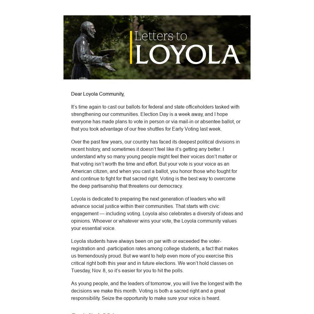 Loyola is dedicated to preparing the next generation of leaders who will advance social justice within their communities. That starts with civic engagement — including voting. Loyola also celebrates a diversity of ideas and opinions. Whoever or whatever wins your vote, the Loyola community values your essential voice.