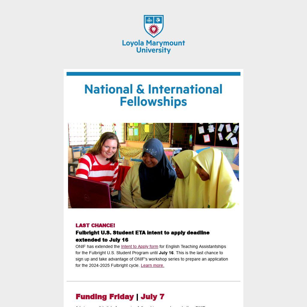 ONIF will be closed from July 10 through July 14. If you have an immediate concern, please email fellowships@lmu.edu or schedule a Zoom meeting. ONIF will reply to inquiries on July 17.