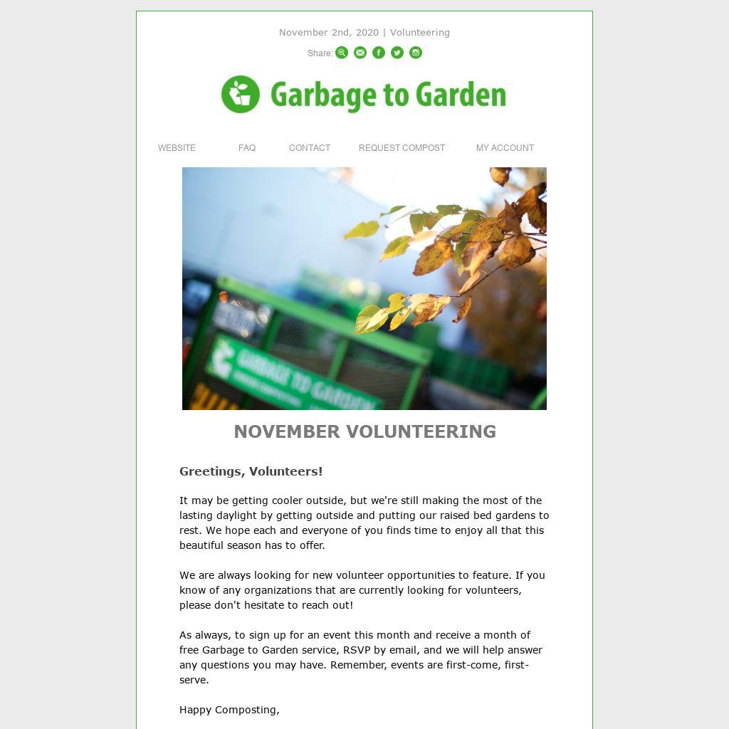 As always, to sign up for an event this month and receive a month of free Garbage to Garden service, RSVP by email, and we will help answer any questions you may have. Remember, events are first-come, first-serve.