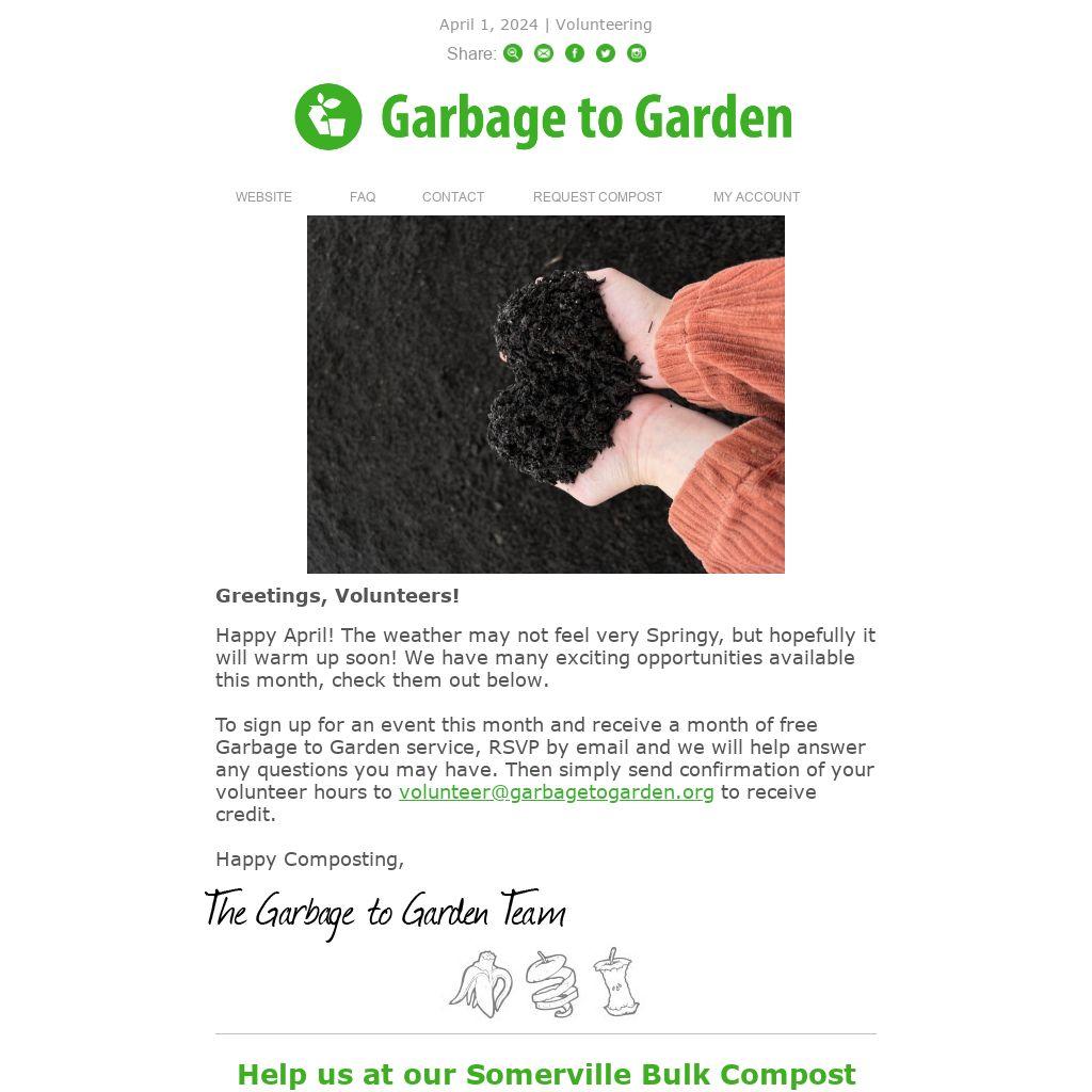 Garbage to Garden will be distributing Spring Fling bulk compost in Somerville on April 27th. We need some volunteers to help! Email volunteer@garbagetogarden.org if you would be interested, please include which shift you are available for in your email!