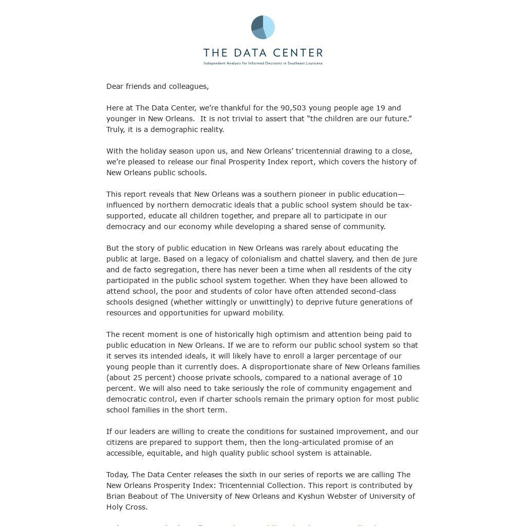 With the holiday season upon us, and New Orleans’ tricentennial drawing to a close, we’re pleased to release our final Prosperity Index report, which covers the history of New Orleans public schools.