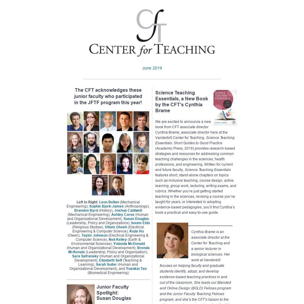 The CFT recently launched a blog series called Teaching Innovations at Vanderbilt, authored by CFT undergraduate intern Faith Roven. Faith interviews faculty members about interesting approaches they use in their teaching, providing useful ideas and a bit of student perspective. Check out the posts on the nine instructors—Corbette Doyle, Allison Leich Hilbun, Sarah Suiter, Ravi Duddu, Daniela D’Eugenio, Mary Lauren Pfieffer, Anna Richmond, Neil Kelley, and Jenn Bradham—who have been featured this spring, and look for new posts when the series resumes in August.