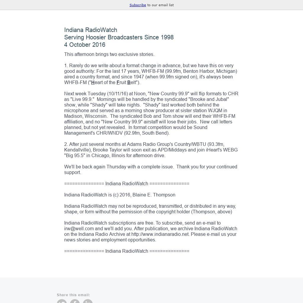 Indiana RadioWatch subscriptions are free. To subscribe, send an e-mail to irw@well.com and we'll add you. After publication, we archive Indiana RadioWatch on the Indiana Radio Archive at http://www.indianaradio.net. Please e-mail us your news stories and employment opportunities.