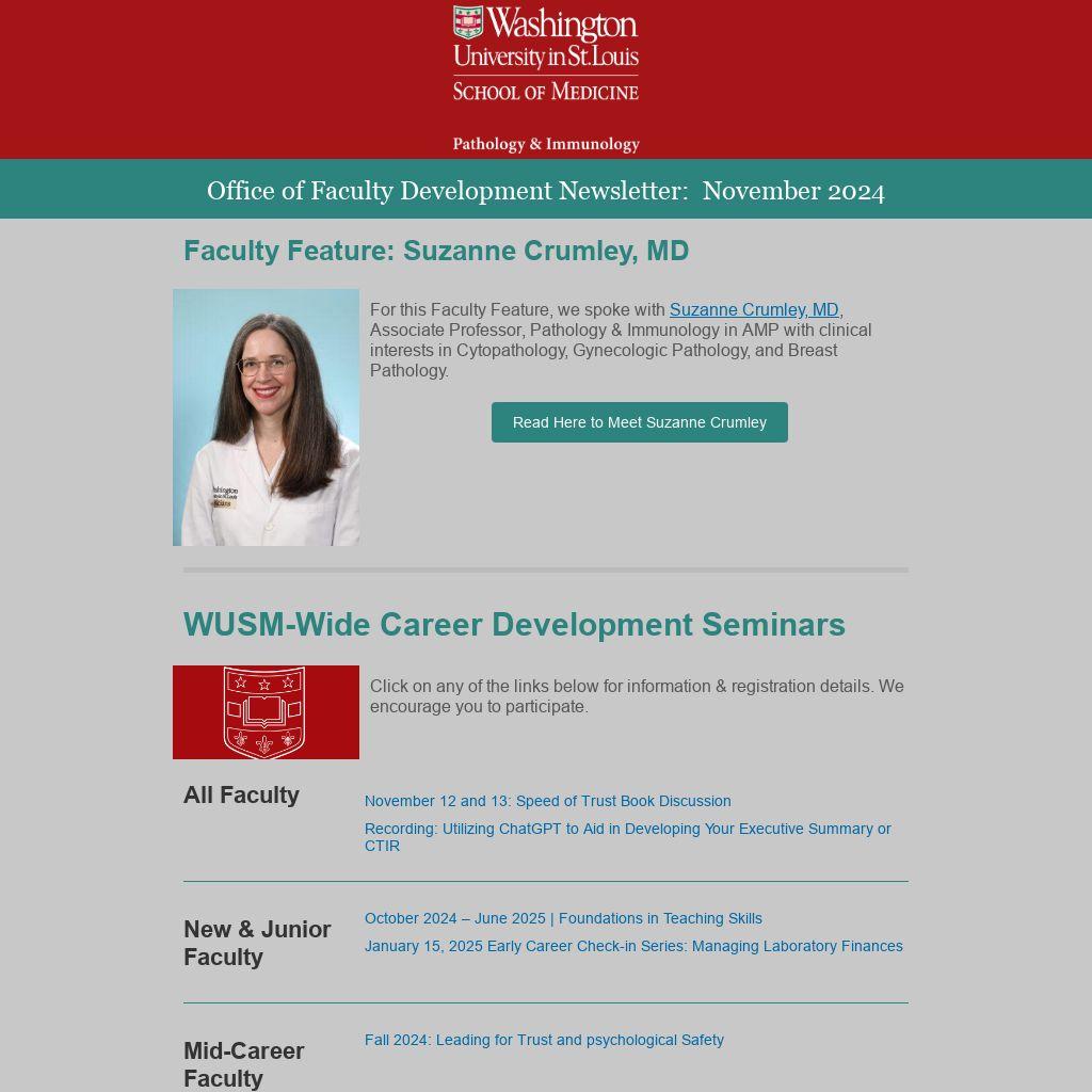 For this Faculty Feature, we spoke with Suzanne Crumley, MD, Associate Professor, Pathology & Immunology in AMP with clinical interests in Cytopathology, Gynecologic Pathology, and Breast Pathology.