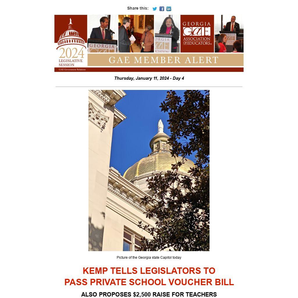 Kemp did have some good news for public education, announcing that he is asking the legislature to raise the salaries of classroom teachers by $2,500. However, he offered nothing for ESPs (Education Support Professionals). GAE is working to get clarification on the details of the raise.