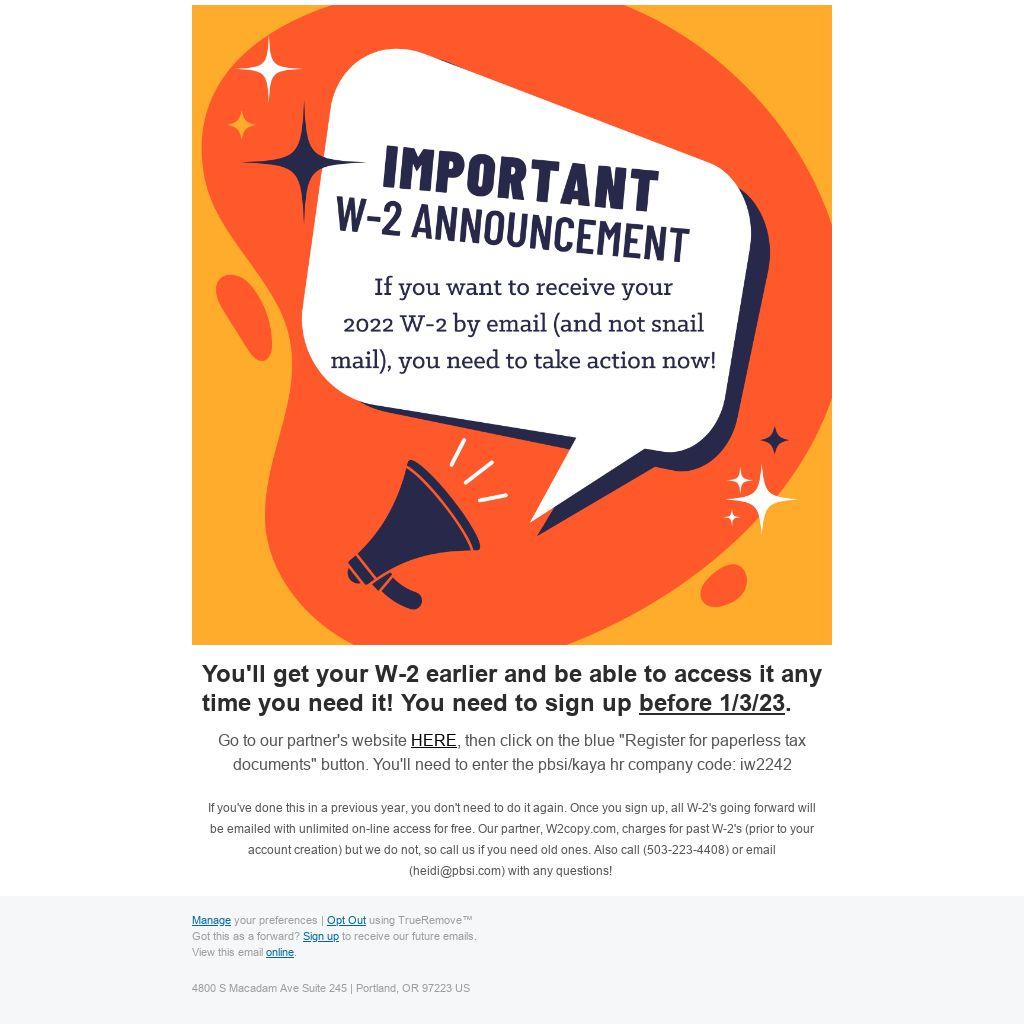 If you've done this in a previous year, you don't need to do it again. Once you sign up, all W-2's going forward will be emailed with unlimited on-line access for free. Our partner, W2copy.com, charges for past W-2's (prior to your account creation) but we do not, so call us if you need old ones. Also call (503-223-4408) or email (heidi@pbsi.com) with any questions!