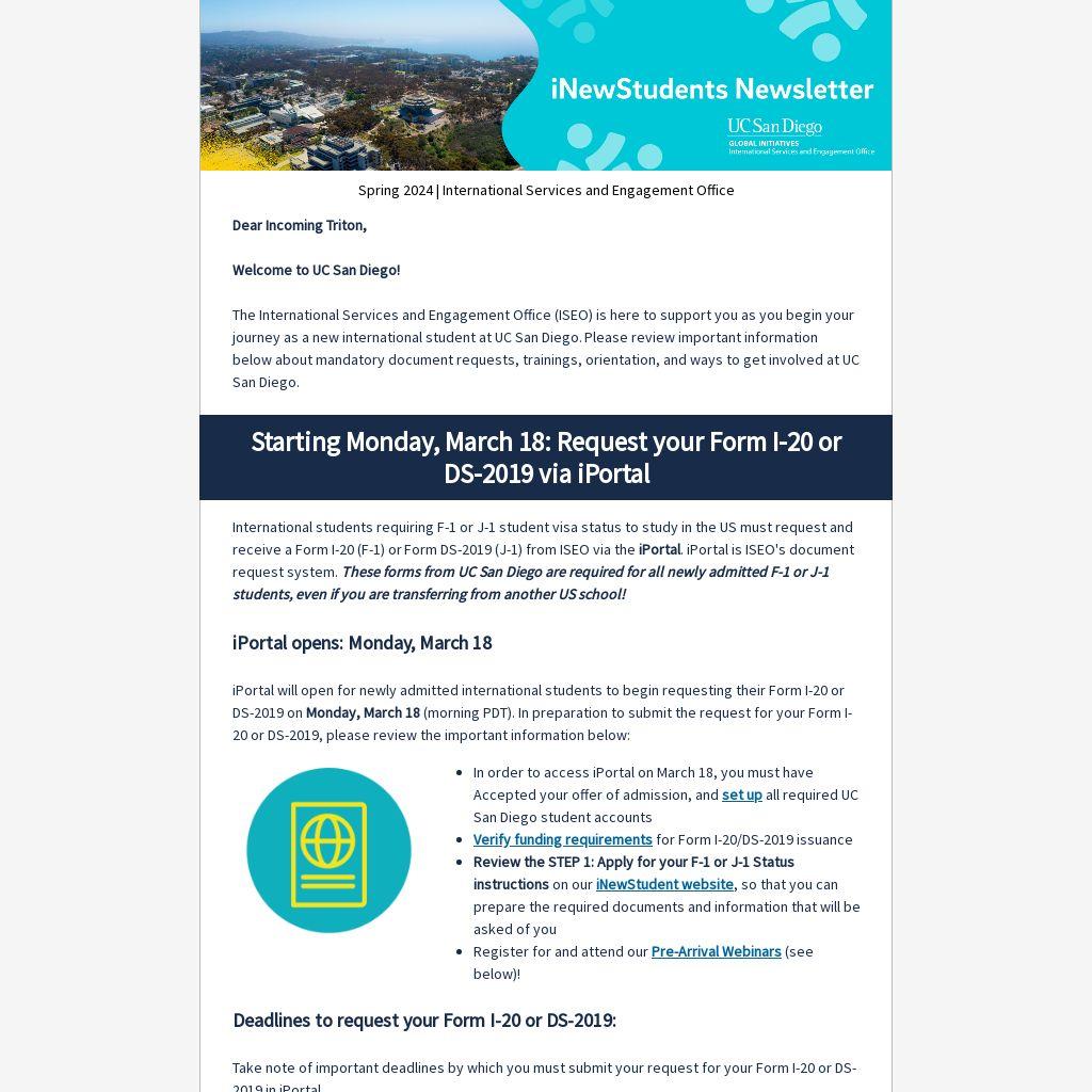 iPortal will open for newly admitted international students to begin requesting their Form I-20 or DS-2019 on Monday, March 18 (morning PDT). In preparation to submit the request for your Form I-20 or DS-2019, please review the important information below: