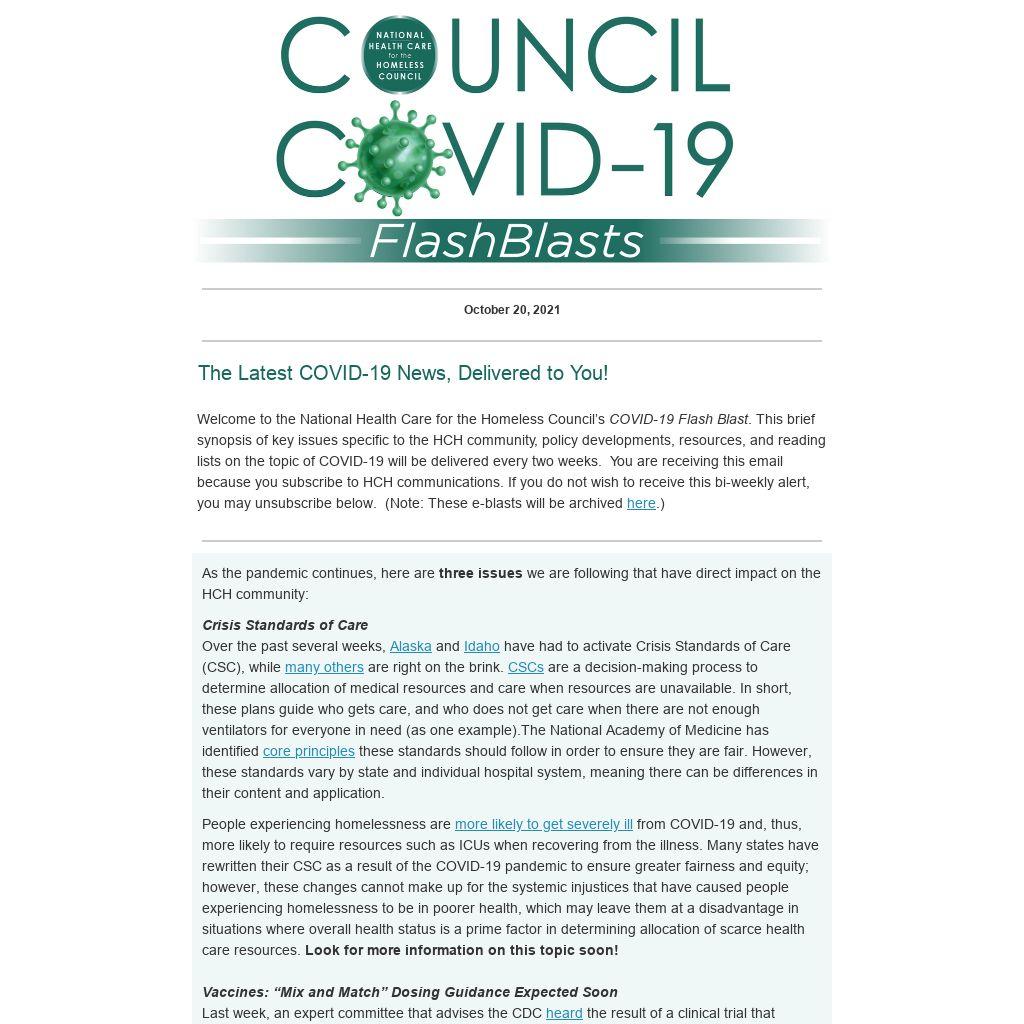 Welcome to the National Health Care for the Homeless Council’s COVID-19 Flash Blast. This brief synopsis of key issues specific to the HCH community, policy developments, resources, and reading lists on the topic of COVID-19 will be delivered every two weeks. You are receiving this email because you subscribe to HCH communications. If you do not wish to receive this bi-weekly alert, you may unsubscribe below. (Note: These e-blasts will be archived here.)