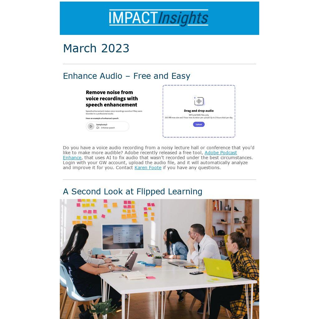 Do you have a voice audio recording from a noisy lecture hall or conference that you’d like to make more audible? Adobe recently released a free tool, Adobe Podcast Enhance, that uses AI to fix audio that wasn’t recorded under the best circumstances. Login with your GW account, upload the audio file, and it will automatically analyze and improve it for you. Contact Karen Foote if you have any questions.