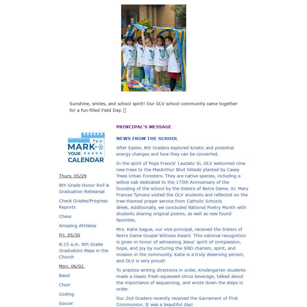 Students returning to OLV next year will receive their summer language arts and math assignments from their teachers. This information will also be posted on the OLV website for your convenience.