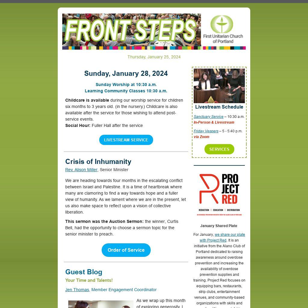 I am reaching out to ask you to consider offering your time and talents to support our community at First Unitarian Portland. We have various volunteer opportunities available, from radically and intentionally hospitable roles to tasks that require newsletter and communication skills, technical skills, and general office administration skills. Additionally, we welcome your involvement in our learning community through assisting our regular Sunday classes or offering to facilitate ongoing adult groups. There is an additional need to help with the many social justice opportunities. Your support is invaluable and greatly appreciated...continue reading.
