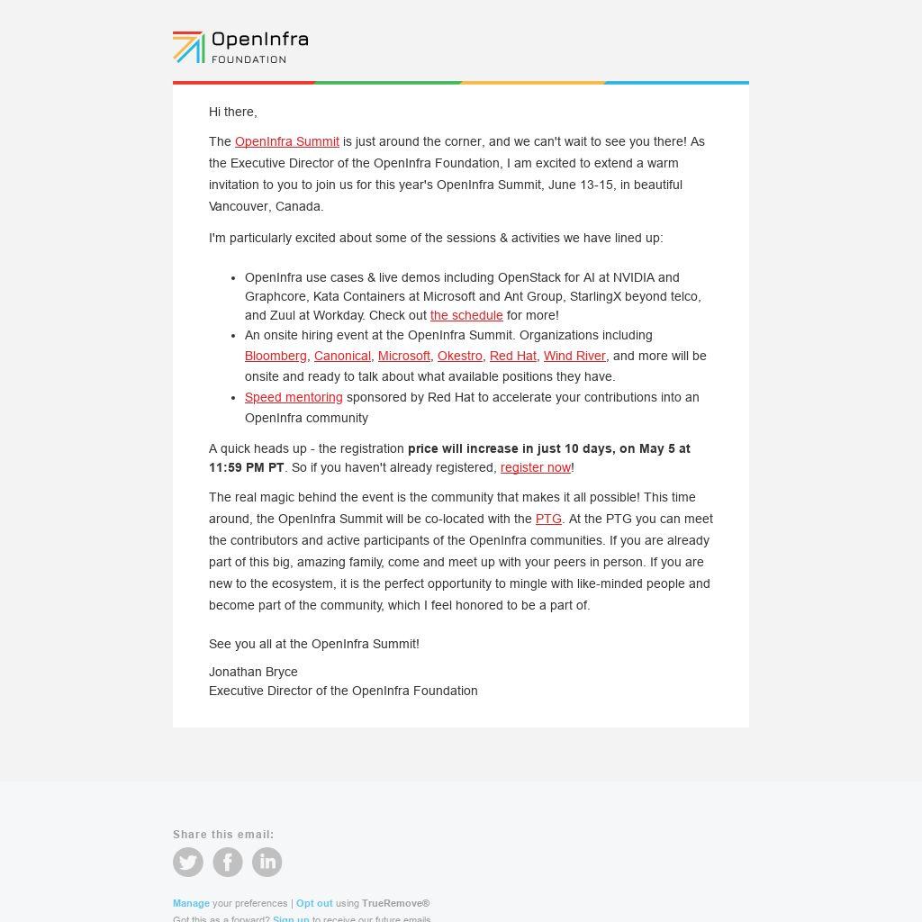 The OpenInfra Summit is just around the corner, and we can't wait to see you there! As the Executive Director of the OpenInfra Foundation, I am excited to extend a warm invitation to you to join us for this year's OpenInfra Summit, June 13-15, in beautiful Vancouver, Canada.