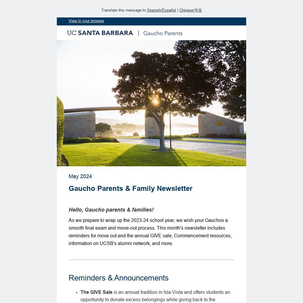 As we prepare to wrap up the 2023-24 school year, we wish your Gauchos a smooth final exam and move-out process. This month's newsletter includes reminders for move out and the annual GIVE sale, Commencement resources, information on UCSB's alumni network, and more.