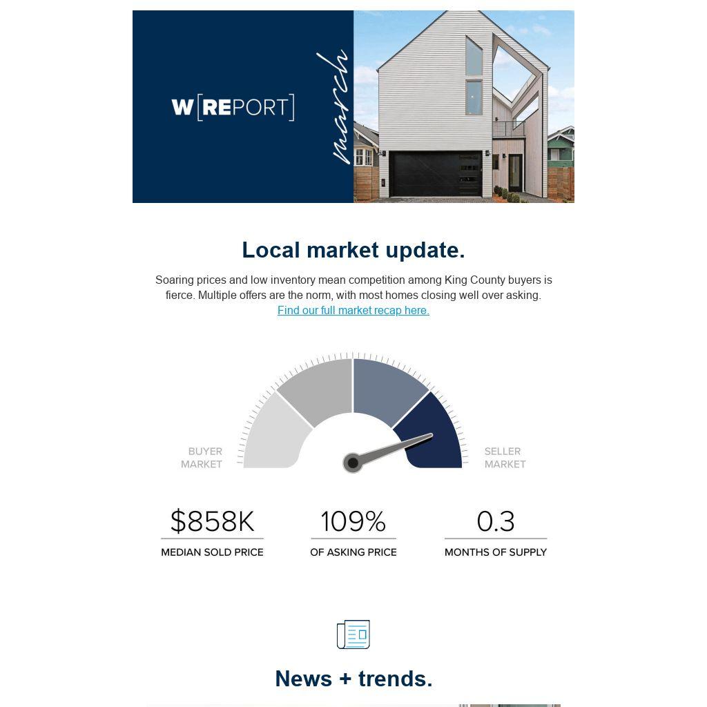 Soaring prices and low inventory mean competition among King County buyers is fierce. Multiple offers are the norm, with most homes closing well over asking. Find our full market recap here.