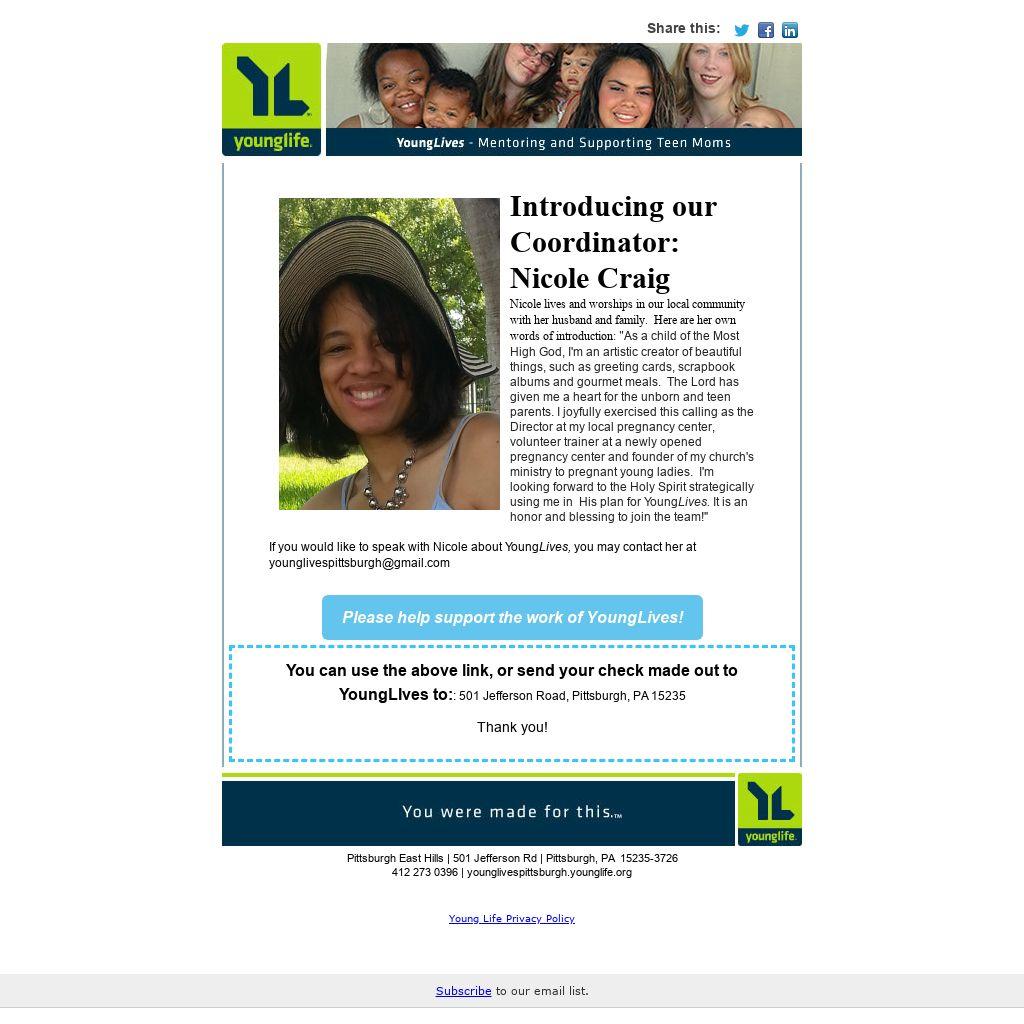If you would like to speak with Nicole about YoungLives, you may contact her at younglivespittsburgh@gmail.com