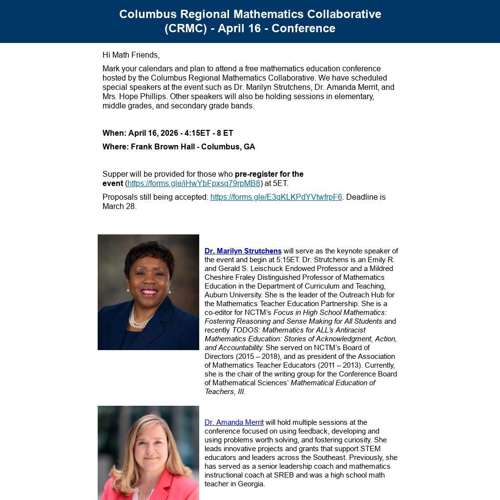 Mark your calendars and plan to attend a free mathematics education conference hosted by the Columbus Regional Mathematics Collaborative. We have scheduled special speakers at the event such as Dr. Marilyn Strutchens, Dr. Amanda Merrit, and Mrs. Hope Phillips. Other speakers will also be holding sessions in elementary, middle grades, and secondary grade bands.
