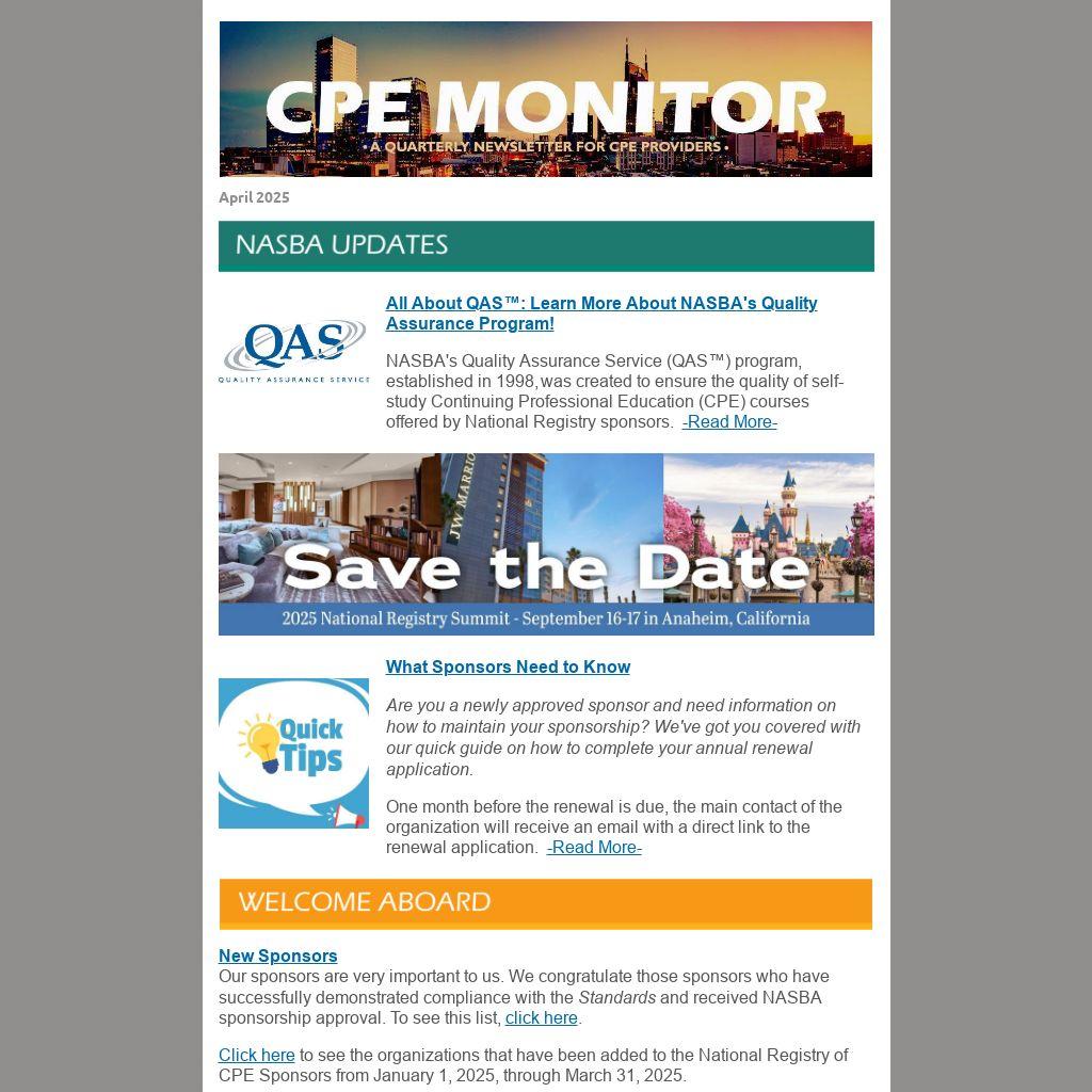 Click here to see the organizations that have been added to the National Registry of CPE Sponsors from January 1, 2025, through March 31, 2025.