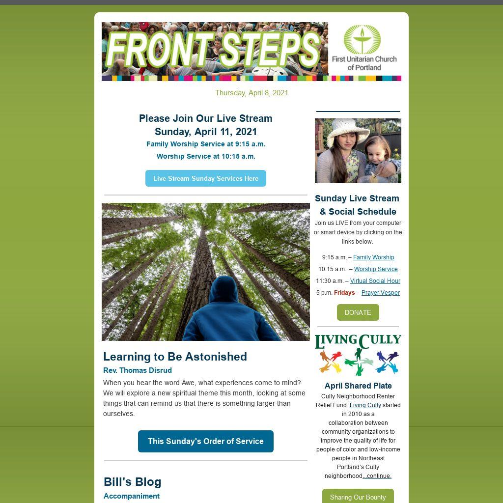 Church Communications: Do you receive messages from the church including this weekly E-News and our Staying Connected emails? To receive church emails send a note to etafuri@firstunitarianportland.org.