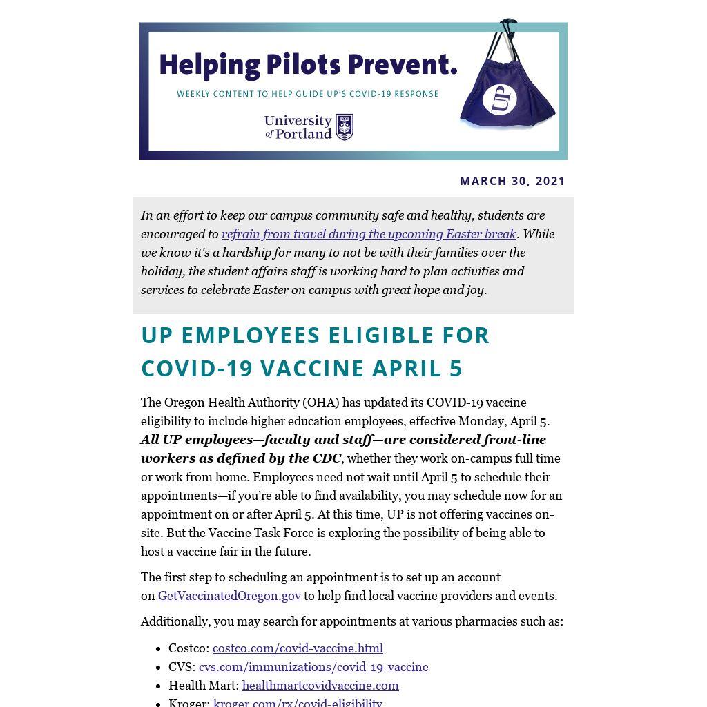 The Oregon Health Authority (OHA) has updated its COVID-19 vaccine eligibility to include higher education employees, effective Monday, April 5. All UP employees—faculty and staff—are considered front-line workers as defined by the CDC, whether they work on-campus full time or work from home. Employees need not wait until April 5 to schedule their appointments—if you’re able to find availability, you may schedule now for an appointment on or after April 5. At this time, UP is not offering vaccines on-site. But the Vaccine Task Force is exploring the possibility of being able to host a vaccine fair in the future.