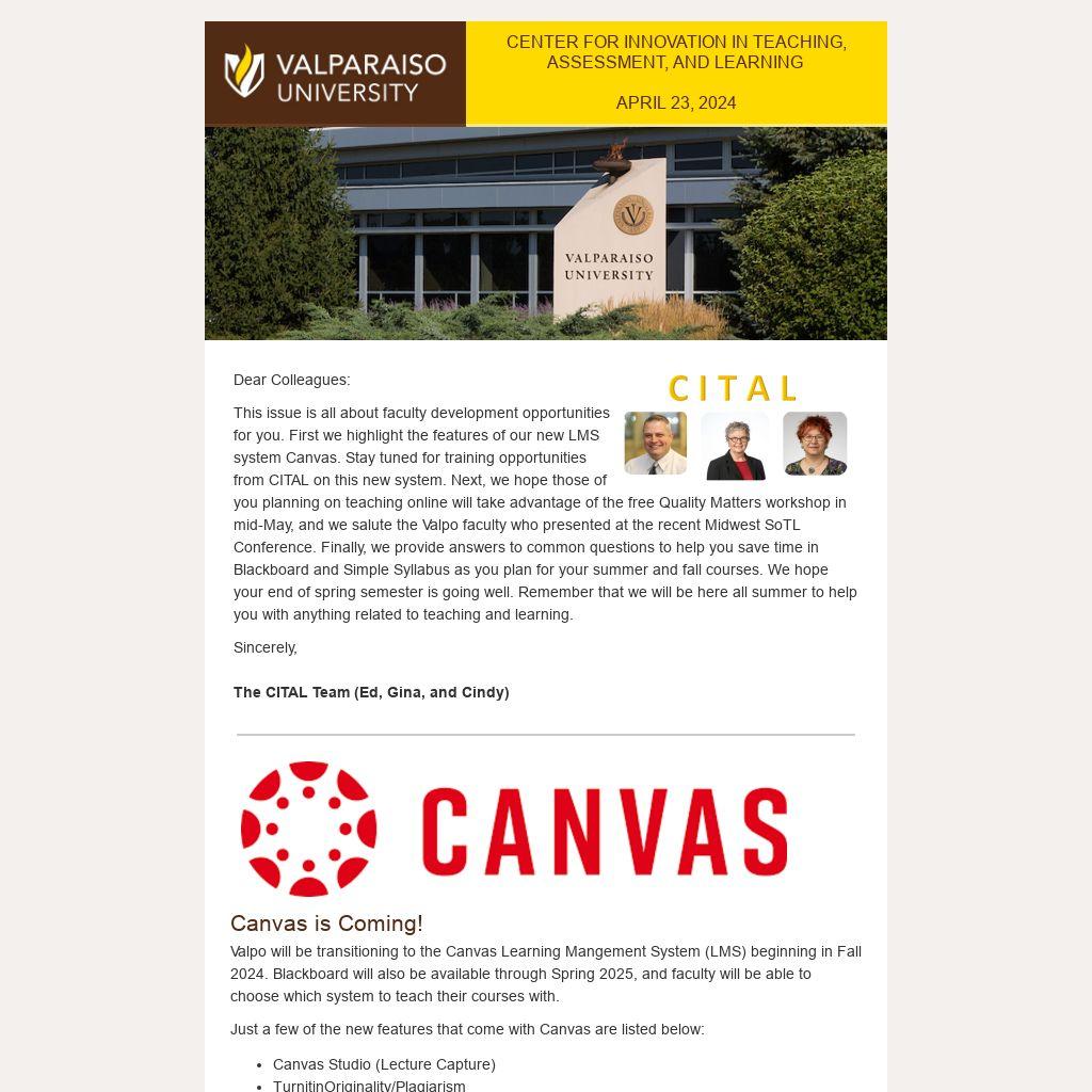 This issue is all about faculty development opportunities for you. First we highlight the features of our new LMS system Canvas. Stay tuned for training opportunities from CITAL on this new system. Next, we hope those of you planning on teaching online will take advantage of the free Quality Matters workshop in mid-May, and we salute the Valpo faculty who presented at the recent Midwest SoTL Conference. Finally, we provide answers to common questions to help you save time in Blackboard and Simple Syllabus as you plan for your summer and fall courses. We hope your end of spring semester is going well. Remember that we will be here all summer to help you with anything related to teaching and learning.