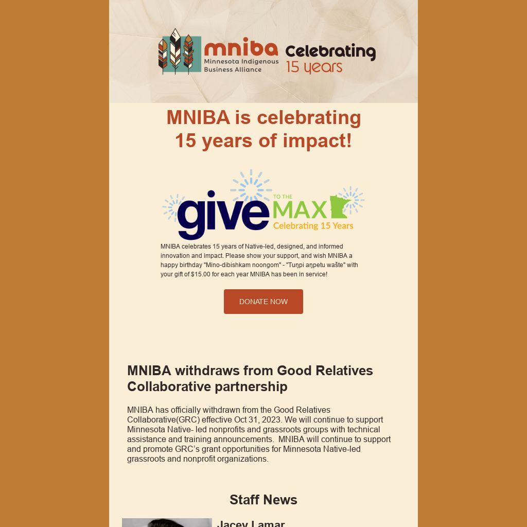 MNIBA celebrates 15 years of Native-led, designed, and informed innovation and impact. Please show your support, and wish MNIBA a happy birthday "Mino-dibishkam noongom" - "Tuŋpi aŋpetu wašte" with your gift of $15.00 for each year MNIBA has been in service!
