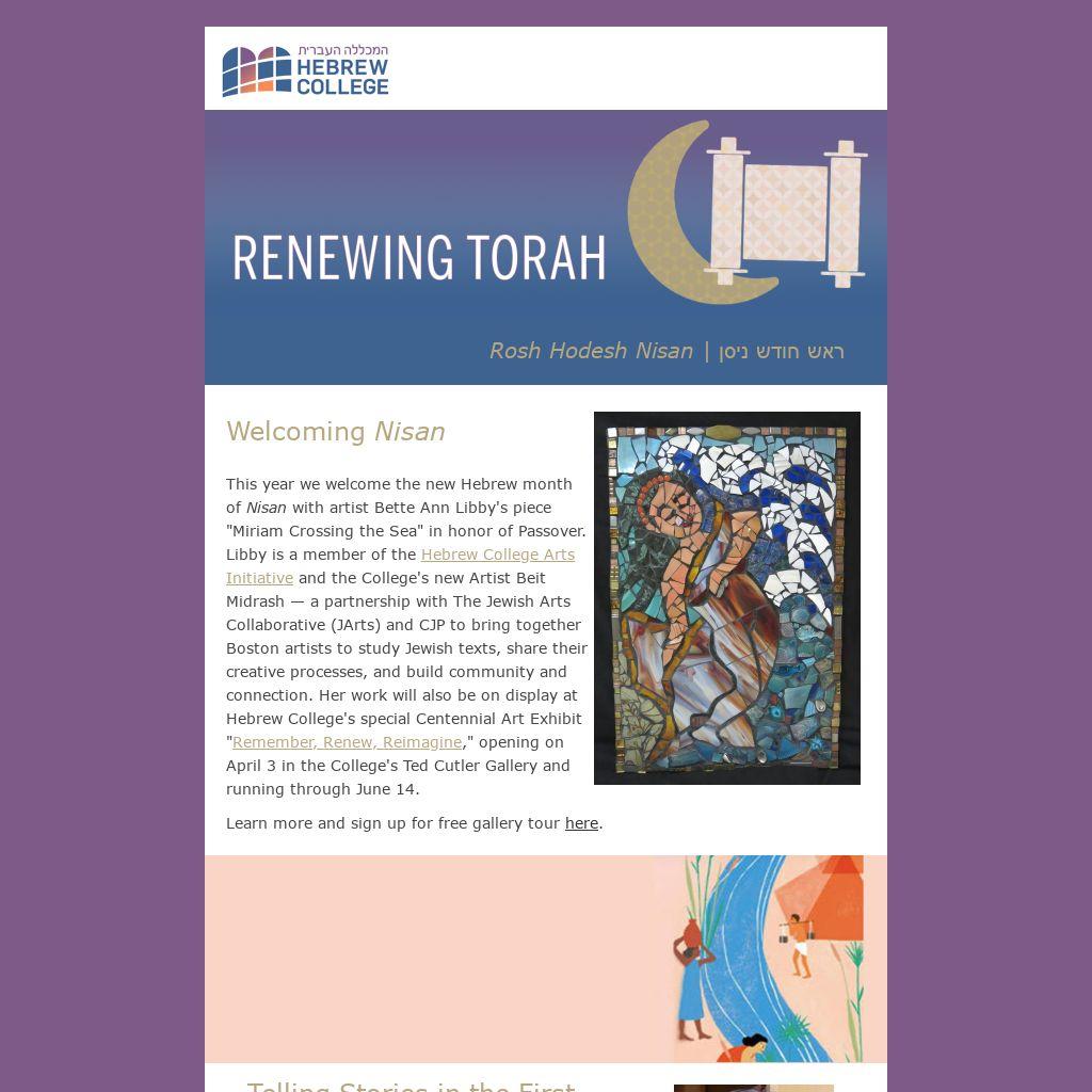 This year we welcome the new Hebrew month of Nisan with artist Bette Ann Libby's piece "Miriam Crossing the Sea" in honor of Passover. Libby is a member of the Hebrew College Arts Initiative and the College's new Artist Beit Midrash — a partnership with The Jewish Arts Collaborative (JArts) and CJP to bring together Boston artists to study Jewish texts, share their creative processes, and build community and connection. Her work will also be on display at Hebrew College's special Centennial Art Exhibit "Remember, Renew, Reimagine," opening on April 3 in the College's Ted Cutler Gallery and running through June 14.