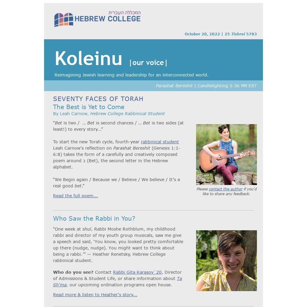 Note: Now that the new year has begun, we want to make sure to share Hebrew College stories and news with you. If you or someone you know has moved or changed email addresses, please update your information so you don't miss out on any of this year's opportunities to learn and celebrate with us!