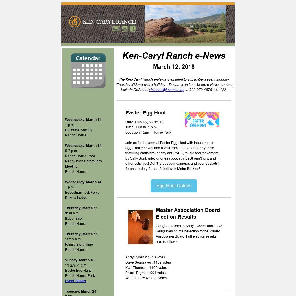 | The Ken-Caryl Ranch e-News is emailed to subscribers every Monday (Tuesday if Monday is a holiday). To submit an item for the e-News, contact Victoria DeSair at victoriad@kcranch.org or 303-979-1876, ext. 122.