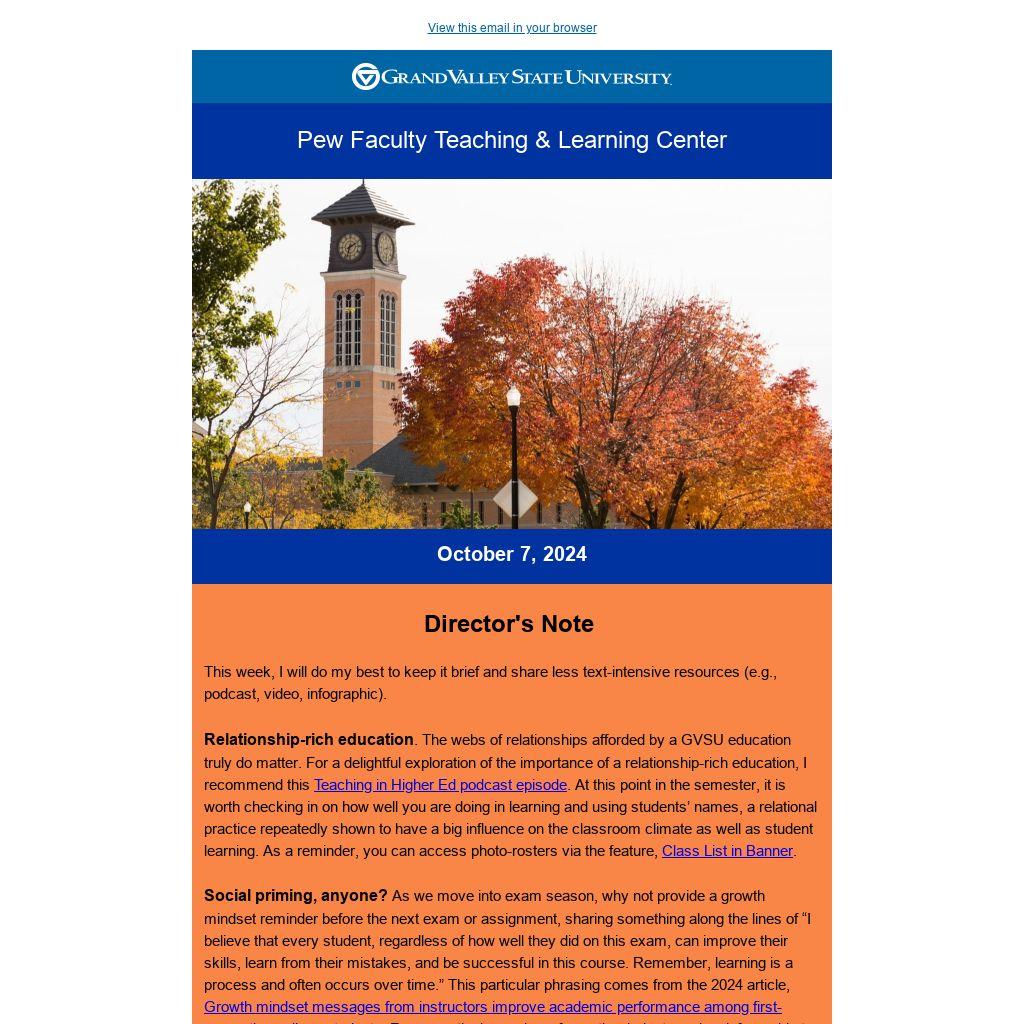 Relationship-rich education. The webs of relationships afforded by a GVSU education truly do matter. For a delightful exploration of the importance of a relationship-rich education, I recommend this Teaching in Higher Ed podcast episode. At this point in the semester, it is worth checking in on how well you are doing in learning and using students’ names, a relational practice repeatedly shown to have a big influence on the classroom climate as well as student learning. As a reminder, you can access photo-rosters via the feature, Class List in Banner.