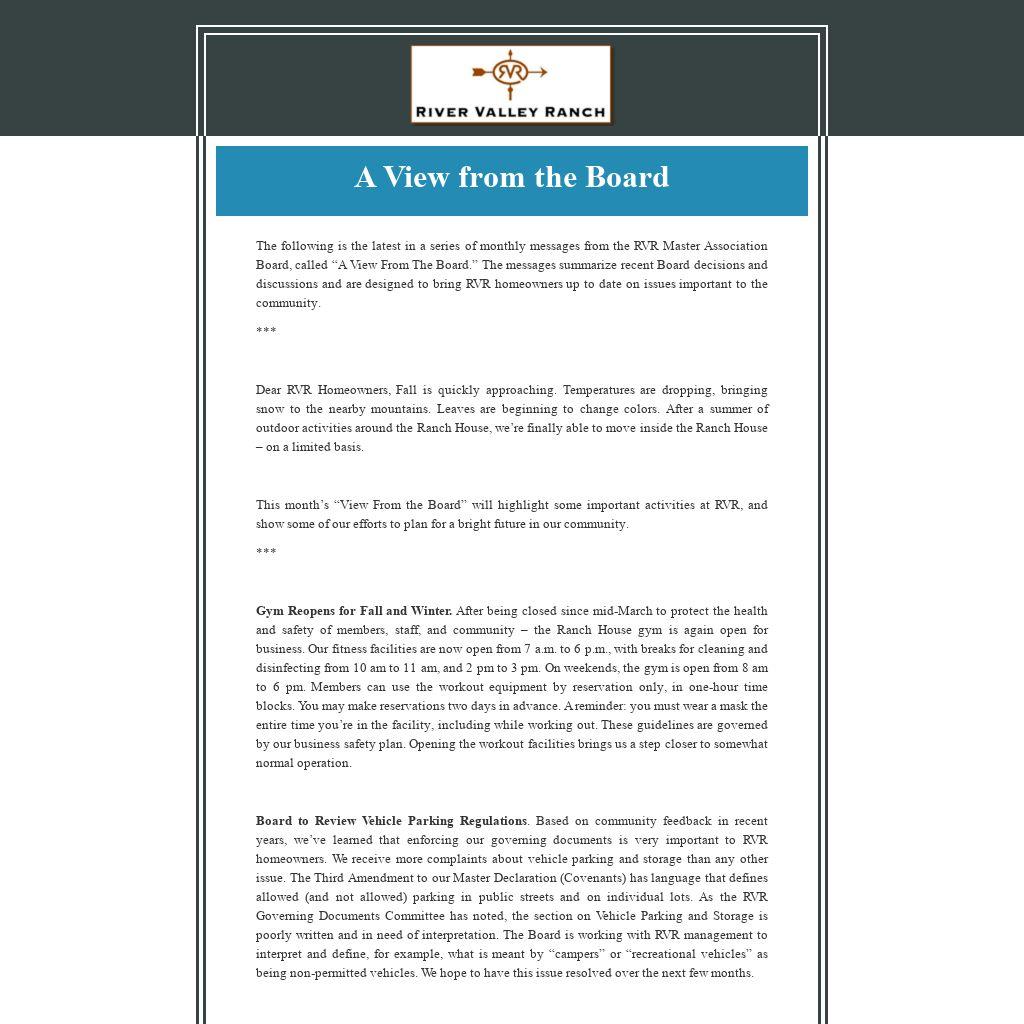 If you have feedback on these items or any others, please share it with Community Services Manager Kendra Ford (csm@rvrcommunity.com). She’ll pass your comments along to the Board, or respond to you directly. Our next Board meeting is Wednesday, Sept. 23 at 5:30 pm. The meeting will be held via Zoom. You will receive an agenda for that meeting, as you always do, no later than the weekend before the meeting. The agenda will include directions for homeowners interested in Zooming into the meeting. Hope to “see” you there.