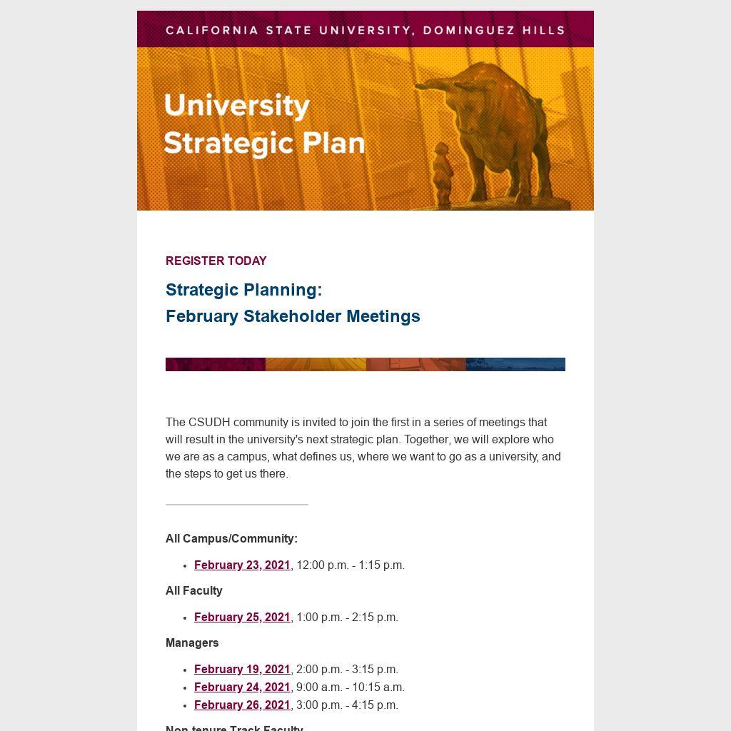 The strategic planning process involves seeking the input of numerous stakeholder groups -- including students, faculty, staff, administration, alumni and members of the community. While we have a number of meetings planned, we know not everyone can attend. A questionnaire has been developed to allow the campus community to share their ideas as part of this collaborative process.