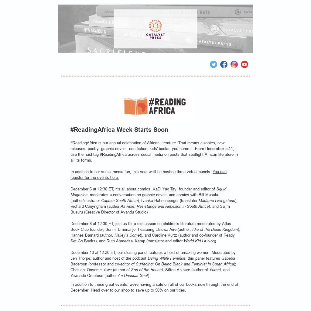 December 5-11, use the hashtag #ReadingAfrica across social media on posts that spotlight African literature in all its forms.