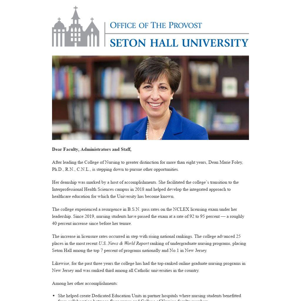 Please join me in thanking Dean Foley for her leadership and fierce dedication to the college and its students. Her last day at Seton Hall will be June 2, 2023. We will move swiftly to appoint an interim dean and will welcome nominations and self-nominations for the position to provost@shu.edu by April 25.