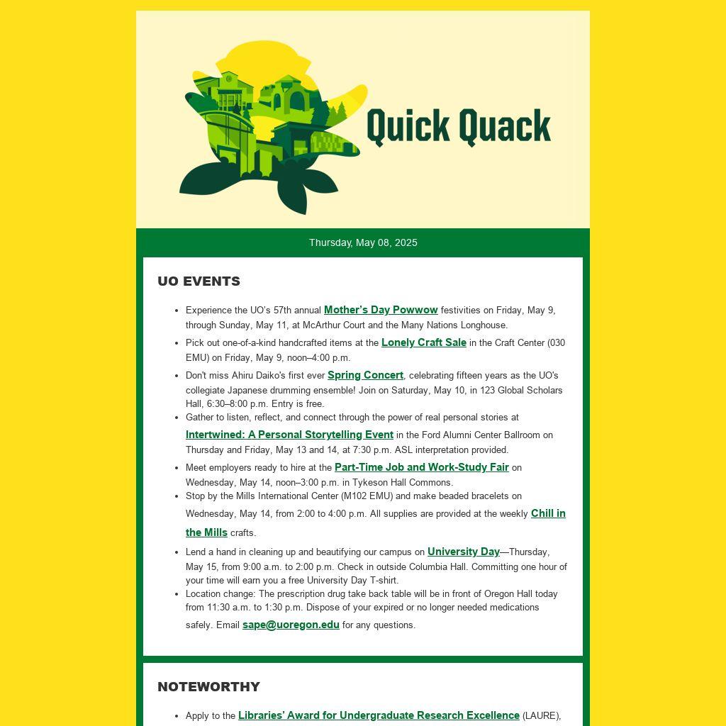 - Experience the UO’s 57th annual Mother’s Day Powwow festivities on Friday, May 9, through Sunday, May 11, at McArthur Court and the Many Nations Longhouse.