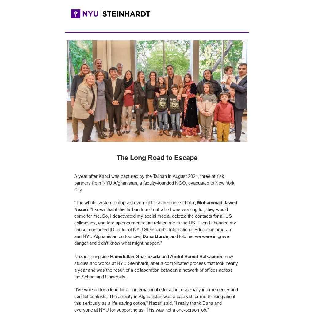 “I’ve worked for a long time in international education, especially in emergency and conflict contexts. The atrocity in Afghanistan was a catalyst for me thinking about this seriously as a life-saving option," Nazari said. “I really thank Dana and everyone at NYU for supporting us. This was not a one-person job."