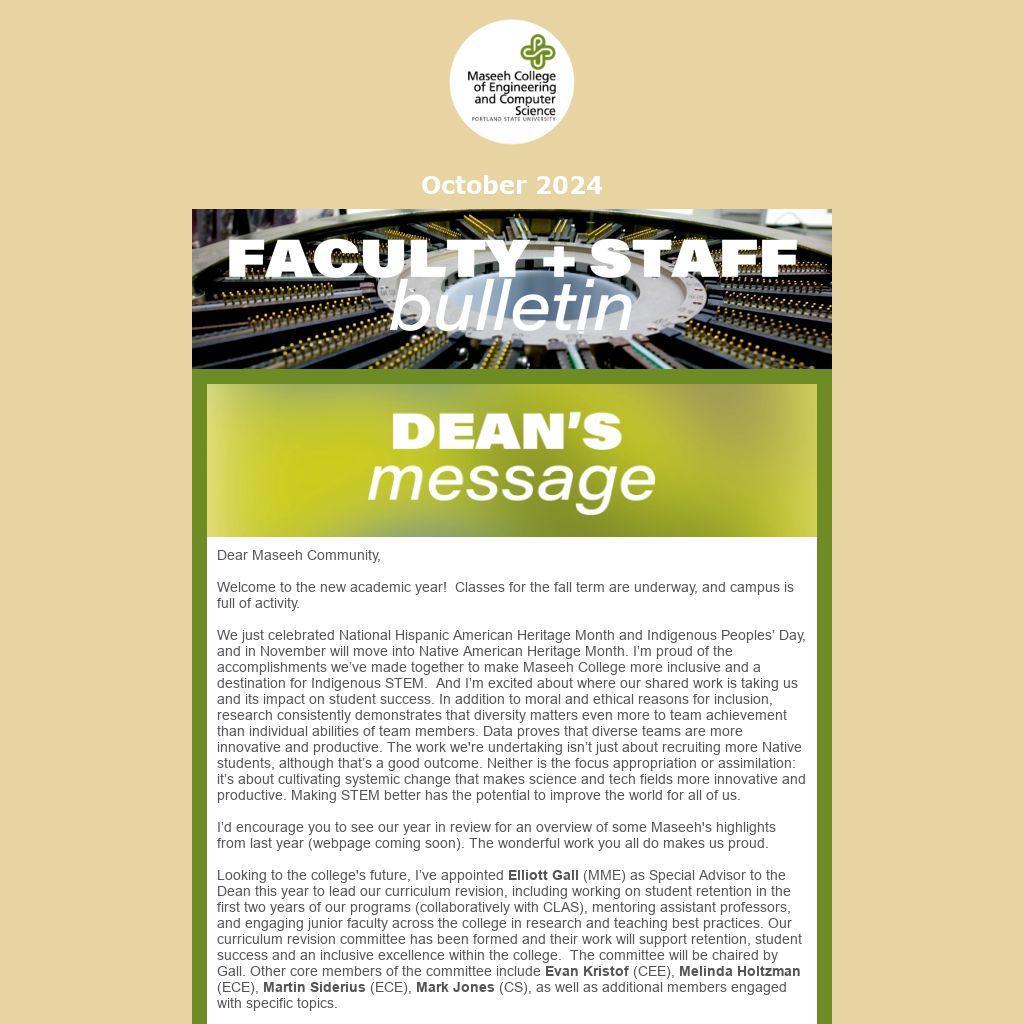 Our strength lies in our collaborative spirit and innovative approach to problem-solving--qualities that define both our academic programs and our approach to administrative challenges. Together, we can ensure that Maseeh College continues to prepare students for competitive jobs in growing industries. Your ongoing support and engagement are vital as we work towards a sustainable and thriving future for our college and the broader university community.