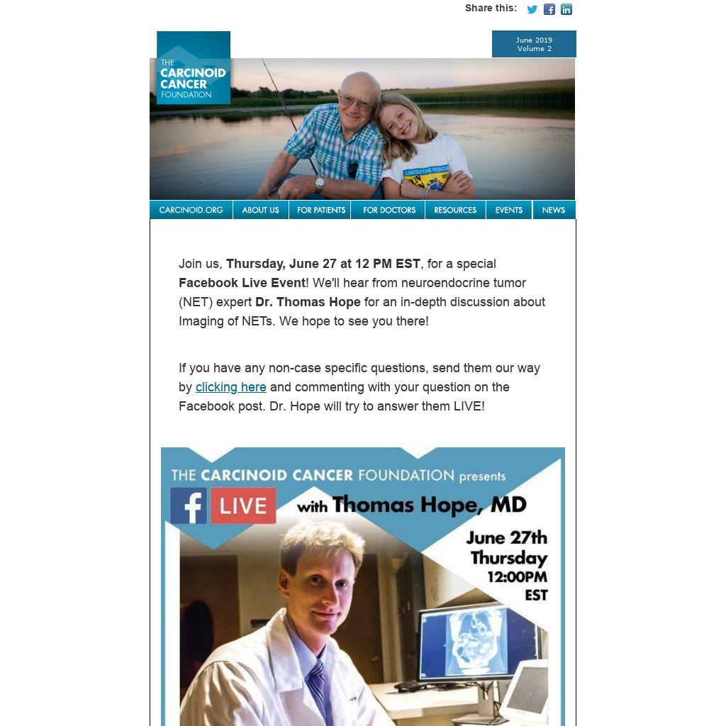 Join us, Thursday, June 27 at 12 PM EST, for a special Facebook Live Event! We'll hear from neuroendocrine tumor (NET) expert Dr. Thomas Hope for an in-depth discussion about Imaging of NETs. We hope to see you there!