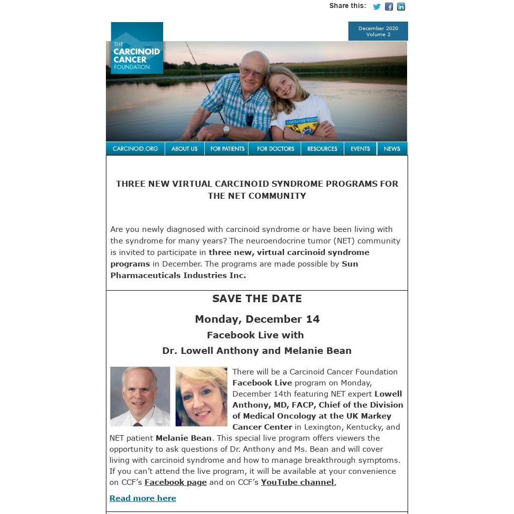 On Tuesday, December 8th, Eric Liu, MD, FACS of the Rocky Mountain Cancer Centers in Denver, Colorado, and Michael Morse, MD, FACP, MHS of Duke Cancer Center in Durham, North Carolina, will be the guest presenters and on Wednesday, December 9th, Lowell Anthony, MD, FACP of UK Markey Cancer Center in Lexington, Kentucky, and Jonathan Strosberg, MD of the Moffitt Cancer Center in Tampa, Florida will be the guest presenters. Both educational webinars will focus on the full range of living well with metastatic neuroendocrine tumors including strategies and options for patients to minimize the impact of the disease.