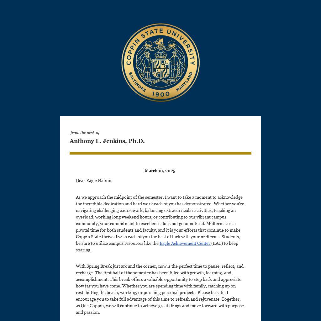 As we approach the midpoint of the semester, I want to take a moment to acknowledge the incredible dedication and hard work each of you has demonstrated. Whether you're navigating challenging coursework, balancing extracurricular activities, teaching an overload, working long weekend hours, or contributing to our vibrant campus community, your commitment to excellence does not go unnoticed. Midterms are a pivotal time for both students and faculty, and it is your efforts that continue to make Coppin State thrive. I wish each of you the best of luck with your midterms. Students, be sure to utilize campus resources like the Eagle Achievement Center (EAC) to keep soaring.