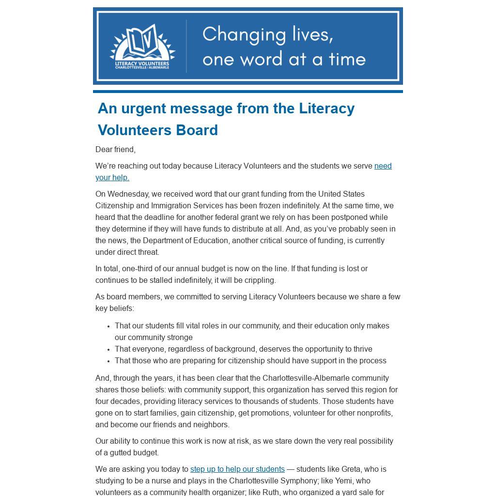 We’re reaching out today because Literacy Volunteers and the students we serve need your help.