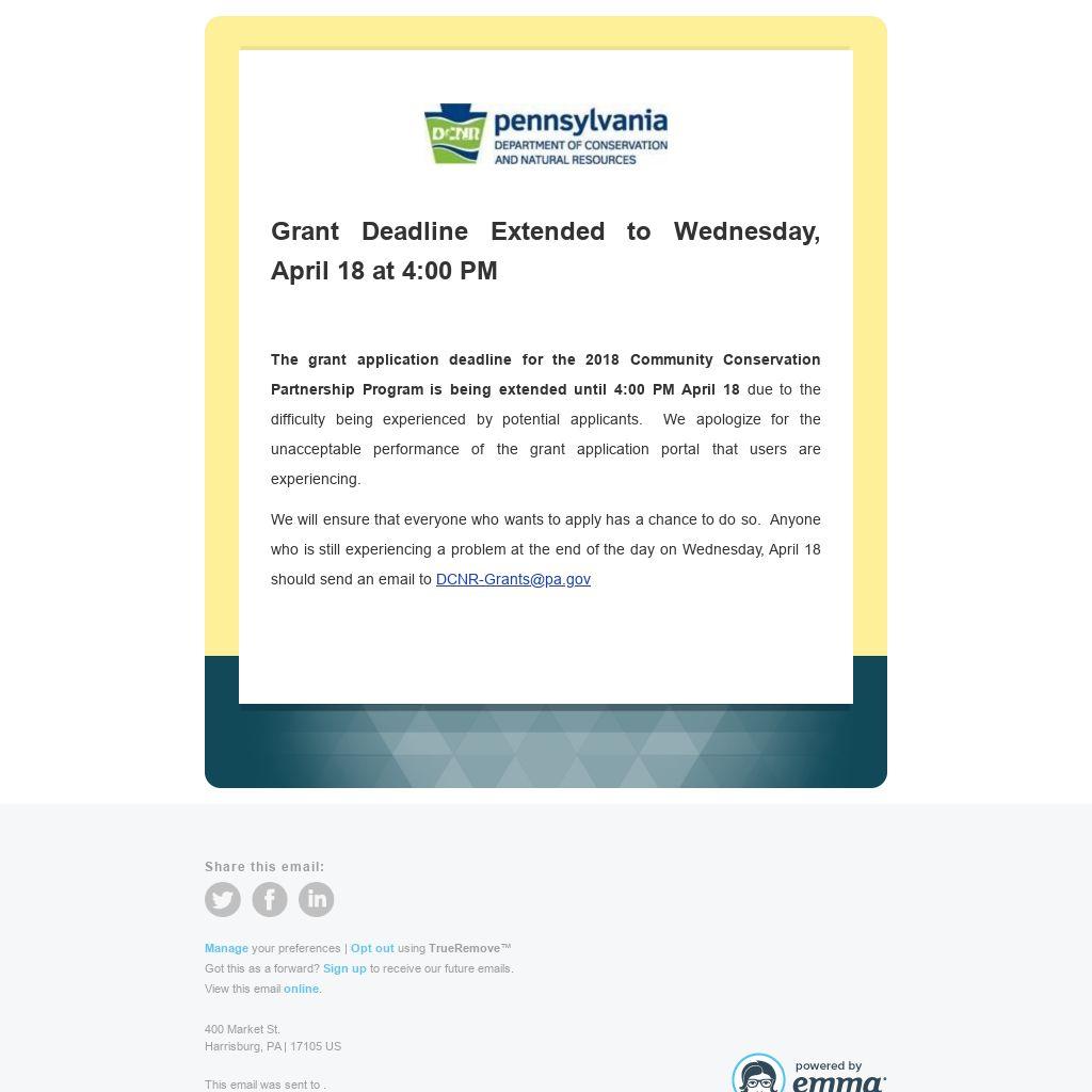 We will ensure that everyone who wants to apply has a chance to do so. Anyone who is still experiencing a problem at the end of the day on Wednesday, April 18 should send an email to DCNR-Grants@pa.gov
