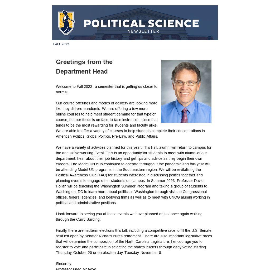 PAC is a nonpartisan group made up primarily of political science majors. PAC's goal is to encourage discussion of contemporary political issues, foreign and domestic, by sponsoring events such as Pizza & Politics and PAC Roundtables. All students are welcome in PAC. Just show up at our meetings with an open mind and a willingness to engage in interesting discussions with other students of all political stripes. Be on the lookout for information about PAC events and meetings on the political science list and on posters throughout the Curry Building. For more information or questions, please contact Dr. Michael Broache (mpbroach@uncg.edu).