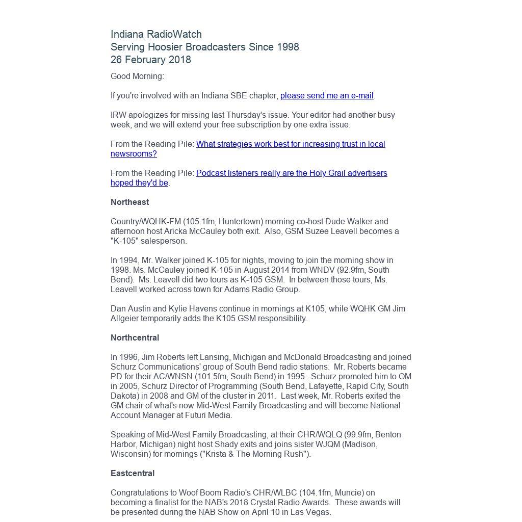 Indiana RadioWatch subscriptions are free. To subscribe, send an e-mail to irw@well.com and we'll add you. After publication, we archive Indiana RadioWatch on the Indiana Radio Archive at http://www.indianaradio.net. Please e-mail us your news stories and employment opportunities.