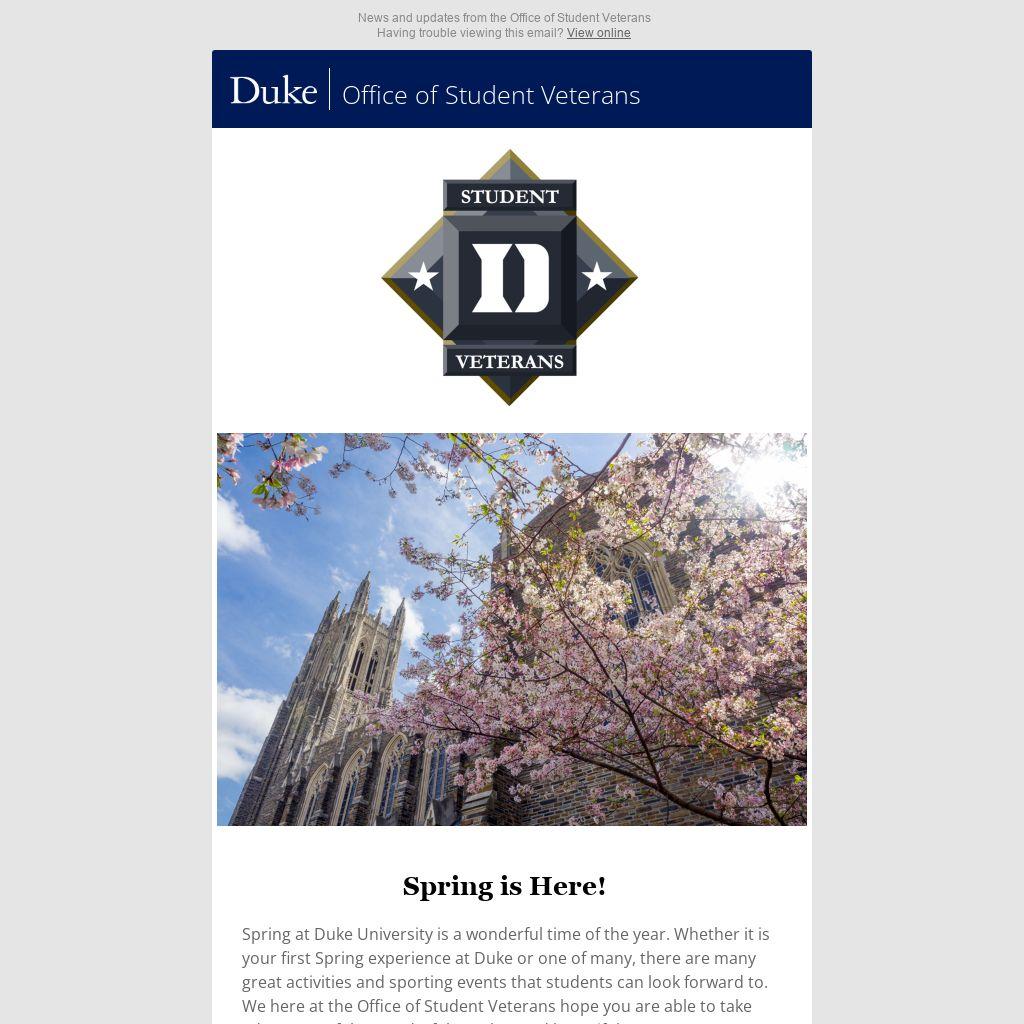 Spring at Duke University is a wonderful time of the year. Whether it is your first Spring experience at Duke or one of many, there are many great activities and sporting events that students can look forward to. We here at the Office of Student Veterans hope you are able to take advantage of the wonderful weather and beautiful scenery on campus!