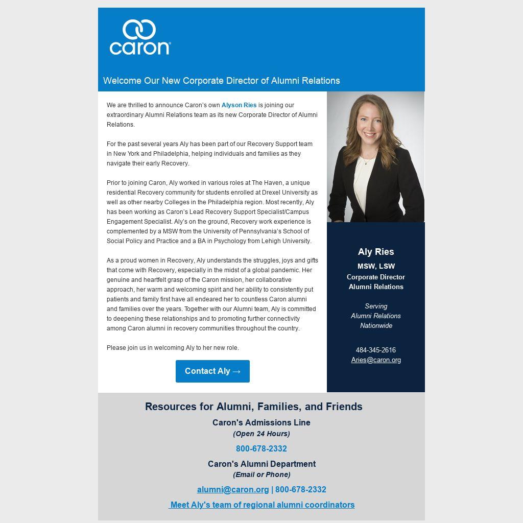 We are thrilled to announce Caron’s own Alyson Ries is joining our extraordinary Alumni Relations team as its new Corporate Director of Alumni Relations.