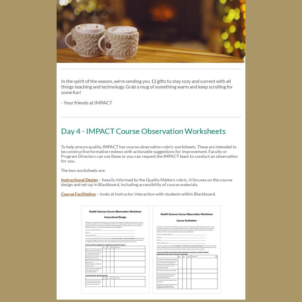 To help ensure quality, IMPACT has course observation rubric worksheets. These are intended to be constructive formative reviews with actionable suggestions for improvement. Faculty or Program Directors can use these or you can request the IMPACT team to conduct an observation for you.