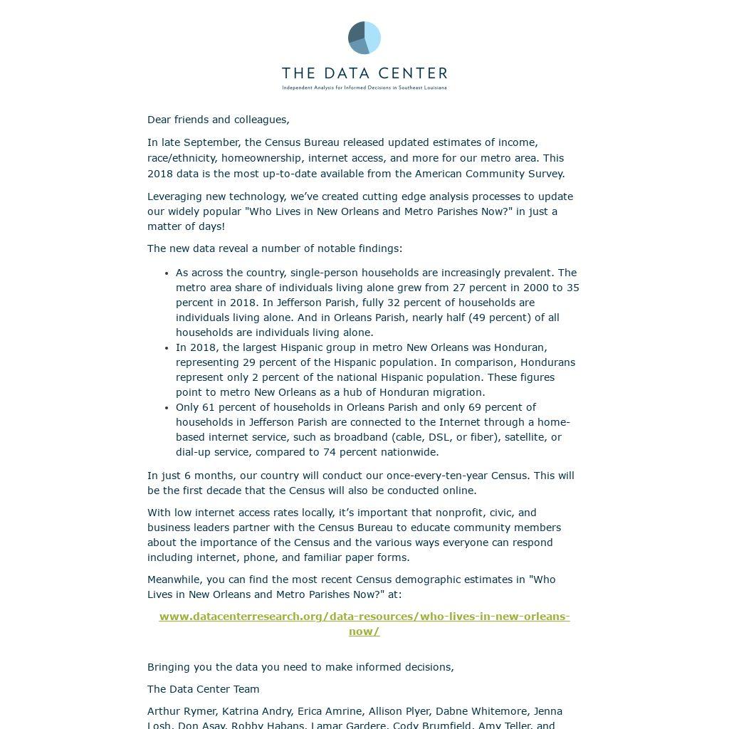 Meanwhile, you can find the most recent Census demographic estimates in "Who Lives in New Orleans and Metro Parishes Now?" at: