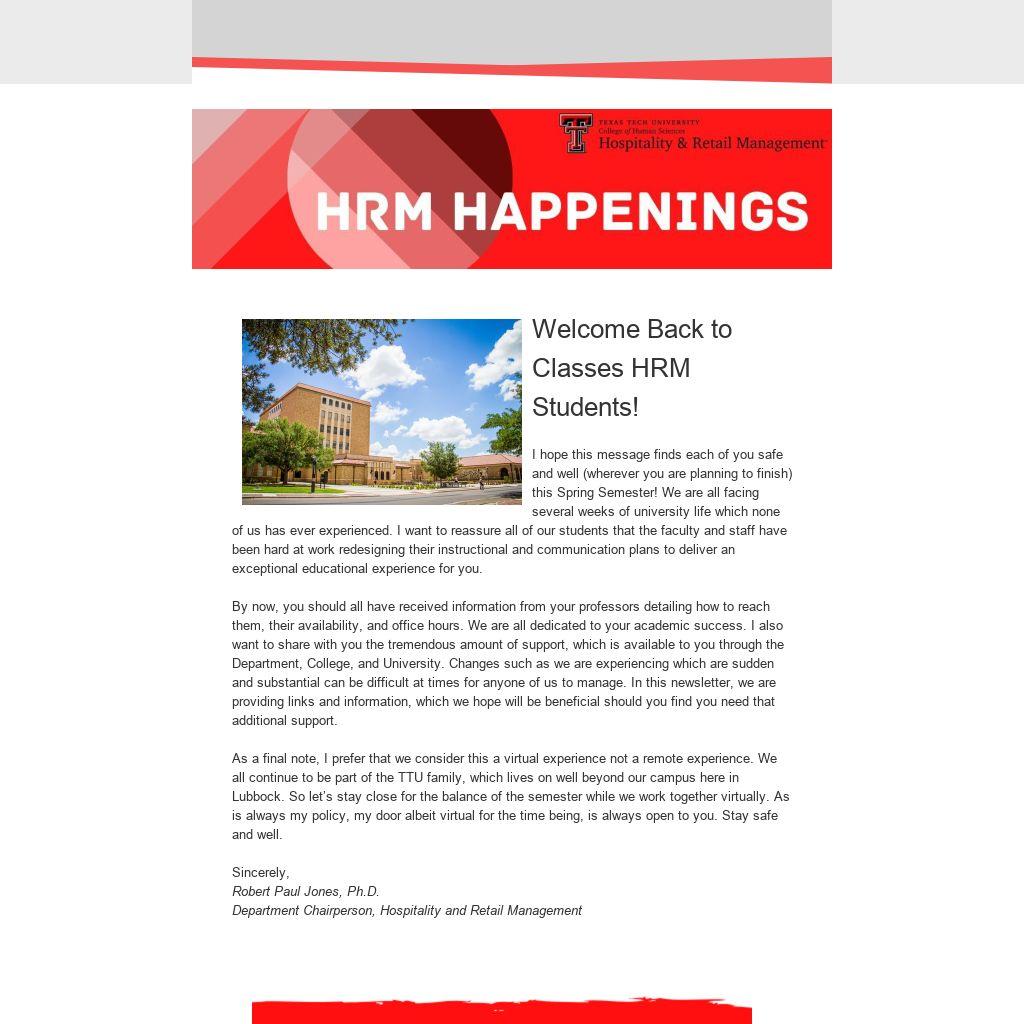 As a final note, I prefer that we consider this a virtual experience not a remote experience. We all continue to be part of the TTU family, which lives on well beyond our campus here in Lubbock. So let’s stay close for the balance of the semester while we work together virtually. As is always my policy, my door albeit virtual for the time being, is always open to you. Stay safe and well.